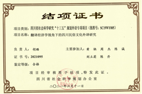 胡璐等,2019-2021,四川省社会科学研究规划项目外语专项,“翻译经济学视角下的四川民俗文化外译研究”。