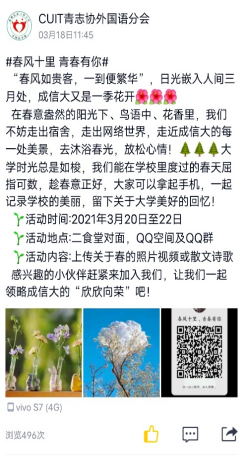 本次“春风十里,青春有你”活动的顺利举行,成功展示了校园春天的景色。在校大学生分享有关校园春景的图片,不仅有利于丰富同学们的校园生活,也使得同学们走出室外,亲近自然,在记录生活同时,提高审美与观察力,激发大学生发现美、欣赏美的意识。同时,此次活动提高了志愿者的服务能力,缓解了同学们的学业疲劳,促进了心情愉悦与身心健康,营造了良好的校园氛围,加深了对母校的真挚感情,留下关于母校的美好记忆。