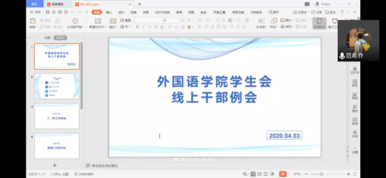 2020年4月3日,受疫情影响,外国语学院学生会通过“腾讯会议”软件进行了线上干部例会。首先学生会副主席张圳进行点名。随后,各部门部长进行了2、3月份的工作总结。虽然有些特色活动暂时无法筹备,但各部门的日常工作仍然照常进行。3月2日-22日,外国语学院举办的“万家灯火,战疫有我”主题线上活动在学生会全体同学的努力下圆满结束,体现了学生会全体人员对疫情形势的关心和对奋斗在前线的人们的诚挚敬意。