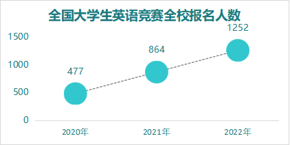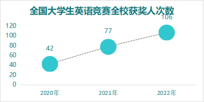 竞赛方面:学院学生绝大多数都参加过至少一次各类竞赛;学院组织竞赛的全校参赛人数也越来越多。以全国大学生英语竞赛为例,2020年全校报名人数为477名,2021年全校报名人数为864名,2022年全校报名人数增加到了1252名。2019年外国语学院联合学校教务处承办了1项省级学科竞赛项目——第25届中国日报社“21世纪•可口可乐杯”全国大学生英语演讲比赛。通过承办该次赛事,外国语学院为学校营造了更为浓厚的英语学习氛围,为四川和重庆两地高校外语教学搭建了交流平台。近几年,学院学生竞赛不断取得突破,获得较好成绩。比如:2021年1名同学在全球40多所高校参与的联合国教科文组织和平中心模拟联合国视讯辩论大会上获得best position,成为唯一获奖的中国大陆学生;全国大学生英语竞赛中2021年我校首次有3名学生冲进全国总决赛并获奖,2022年我校已经有7名学生冲进将于10月举办的全国总决赛,进步明显;全国口译大赛有1名学生冲入了西部大区赛并获得了二等奖等等。此外,囿于专业等多方面原因,以往学院专业学生很少参与创新创业相关的学科竞赛。但是,这种情况近两年已经有了一定改变。2021年,外国语学院学生组队参加了“第三届全国学校冰雪创意设计大赛”。2022年初,学院翻译专业2021级学生首次组队参加了“第十三届中国大学生服务外包创新创业大赛”。2022年9月,外国语学院学生还将首次组队参加“世界青年外交使者大赛”。