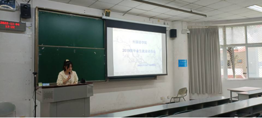 11月4日中午13:00,外国语学院在4112教室召开2023届毕业生就业动员大会,会议由2023届毕业生辅导员王佳梅主持,外国语学院党委书记杨昊、2023届全体毕业生参加会议。